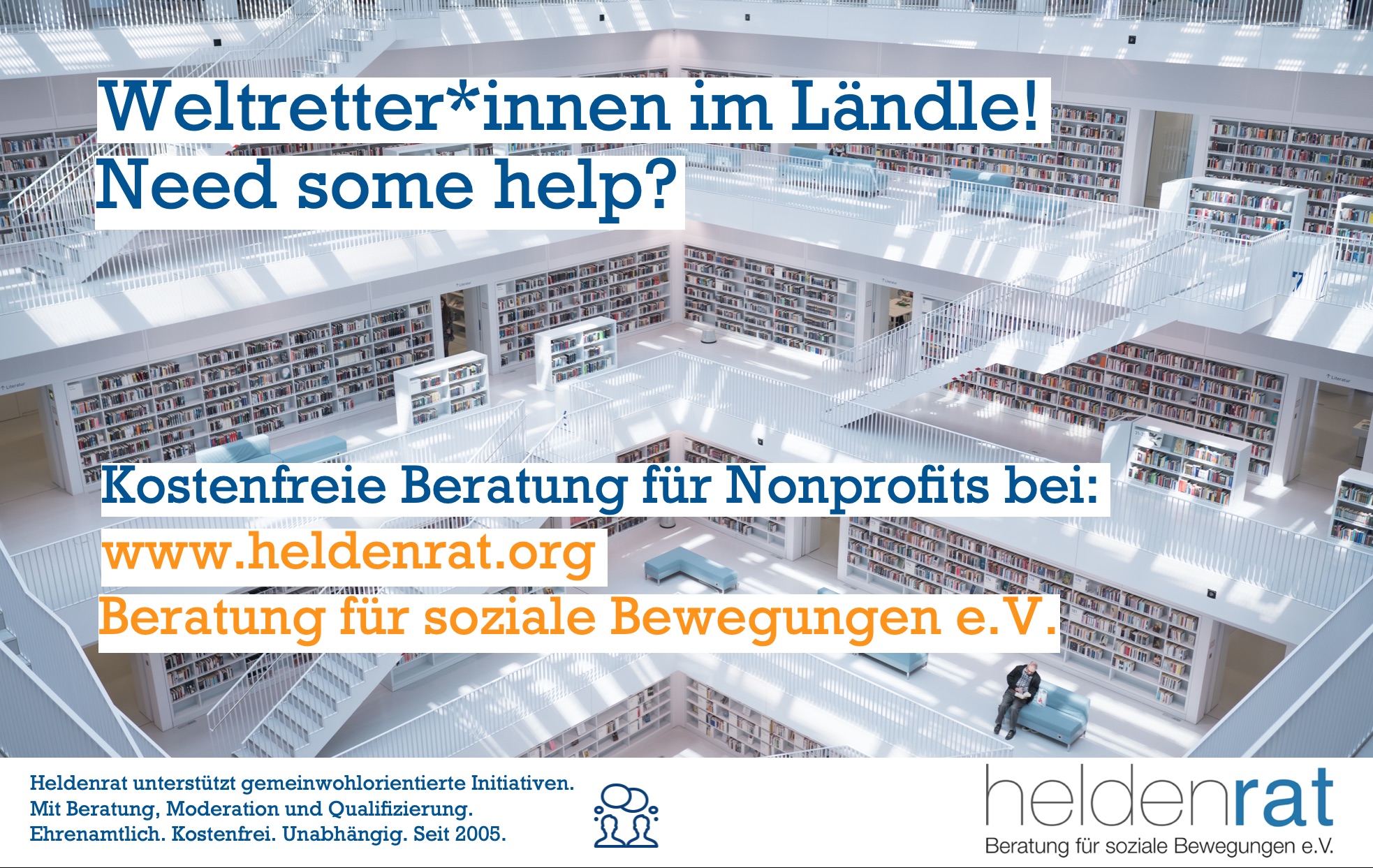 Wir bieten sozialen Initiativen seit 15 Jahren kostenfreie Begleitung und Qualifizierung durch ehrenamtliche Heldenberater*innen – in Projekten über mehrere Abendworkshops oder in einmaligen Gesprächsterminen. Wir sind keine Fachberatung etwa für Rechts- oder Finanzfragen – mit unserer Moderations- und Prozesskompetenz unterstützen wir aber die Problemlösung und den Aufbau von Know-how in gemeinwohlorientierten Organisationen.